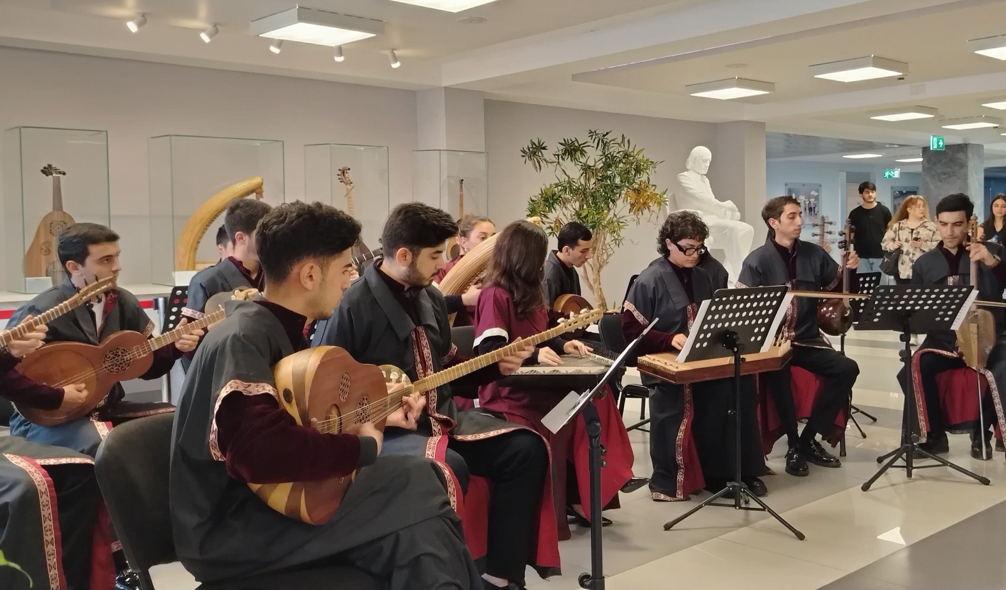 Simpozium öz işini uğurla başa çatdırdıqdan sonra qonaqlar AMK – nın foyesində qədim musiqi alətlərindən ibarət ekspozisiyanın qarşısında AMK-nın tələbələrindən ibarət “Miras” qədim musiqi alətləri ansamblının ifasında Ə. Marağayinin “Hüseyni bəstə” əsərini dinləyiblər.